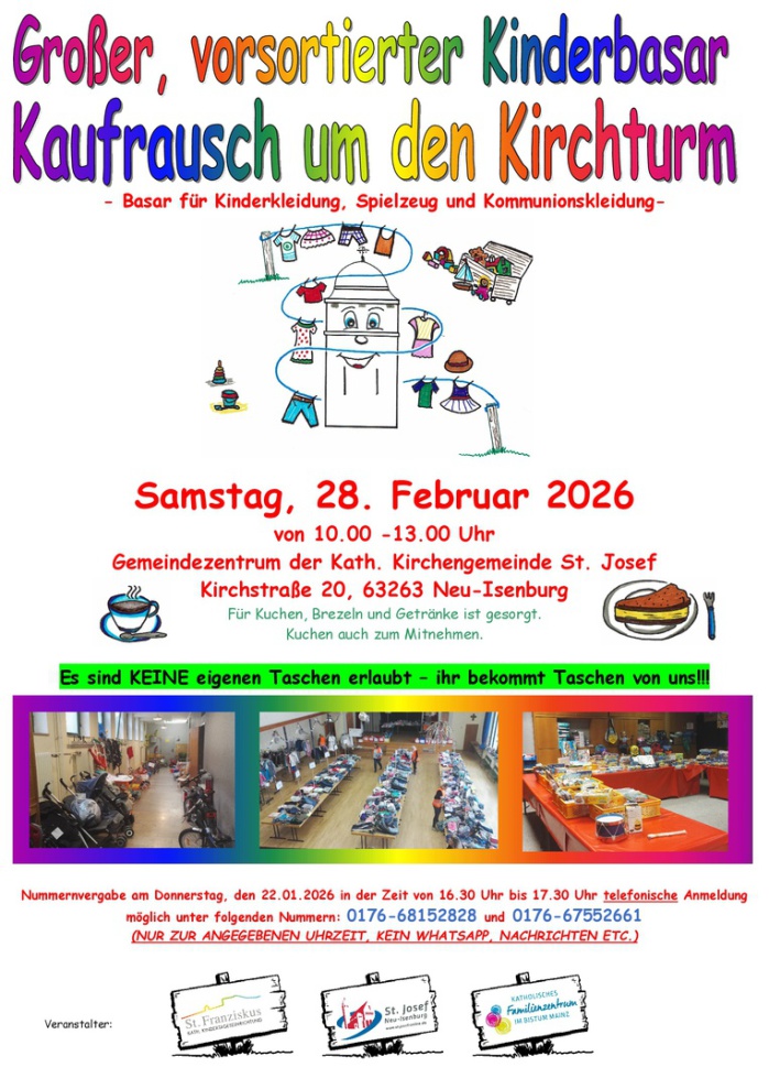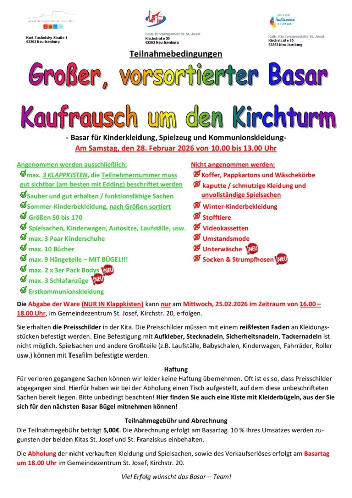 Mit großen Schritten nähern wir uns dem nächsten Basar am Samstag, den 28. Februar 2026. Sollten Sie Fragen zum Basar haben, wenden Sie sich gern per Mail an basar@kita-stjosef-ni.de an Frau Neugebauer oder Frau Rustler.